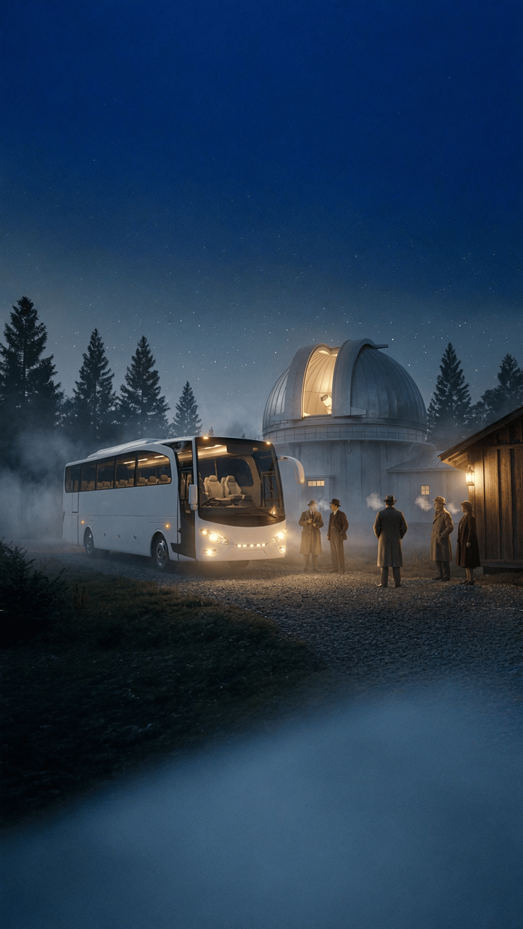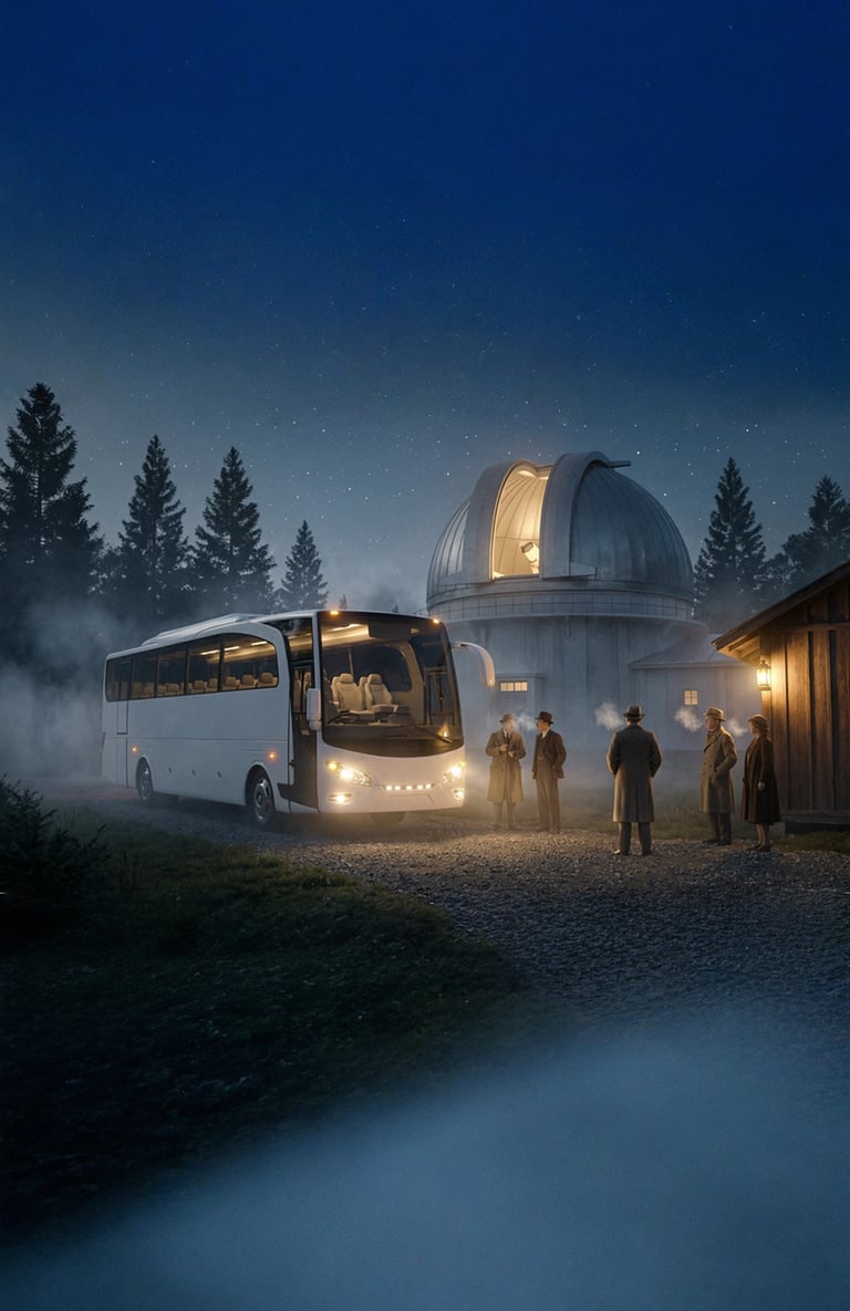 “Studio portraits inside Savoy Homann - front to rear angles, lit like a 1930s travel cinema scene.”