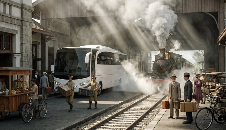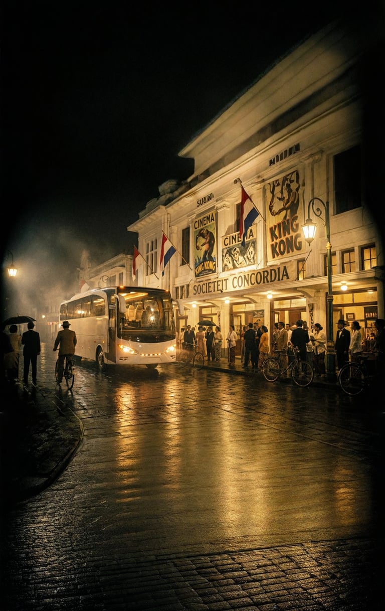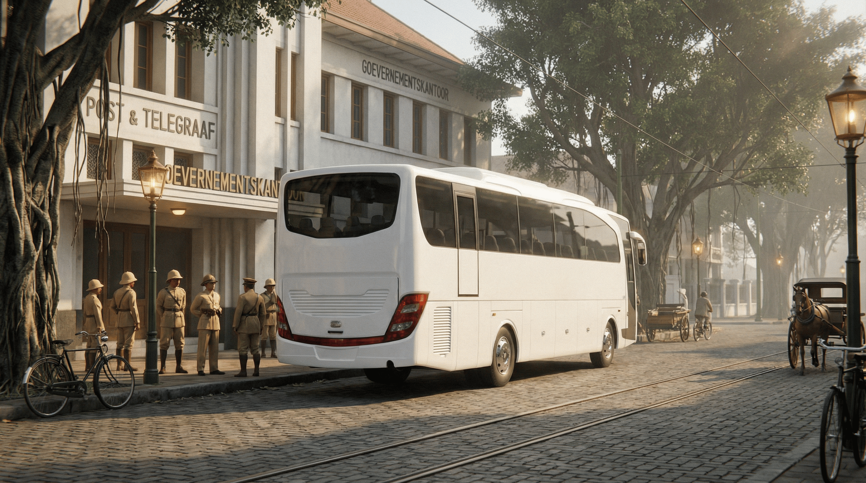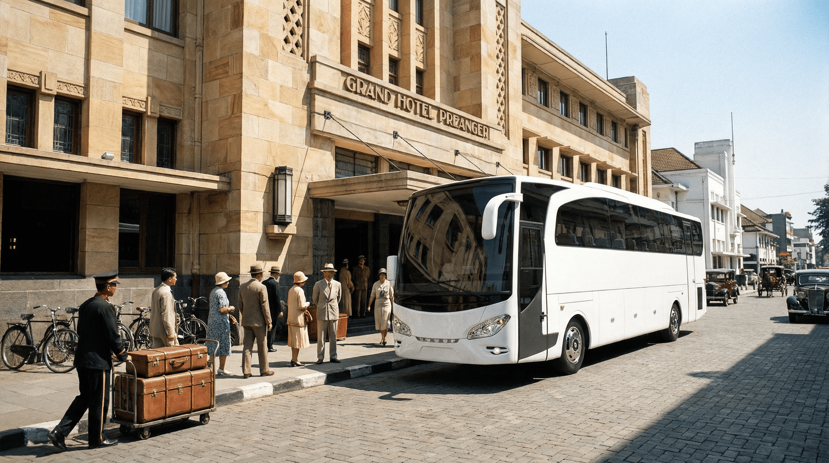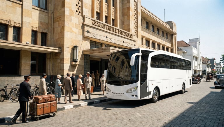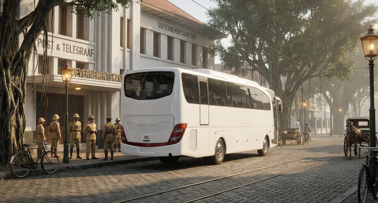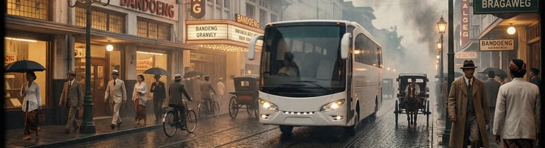 AI visualization: Jetbus 1 travels through a heritage-inspired Bandung in the 1930s passing iconic landmarks reimagined through cinematic, period-inspired streetscapes and atmosphere.