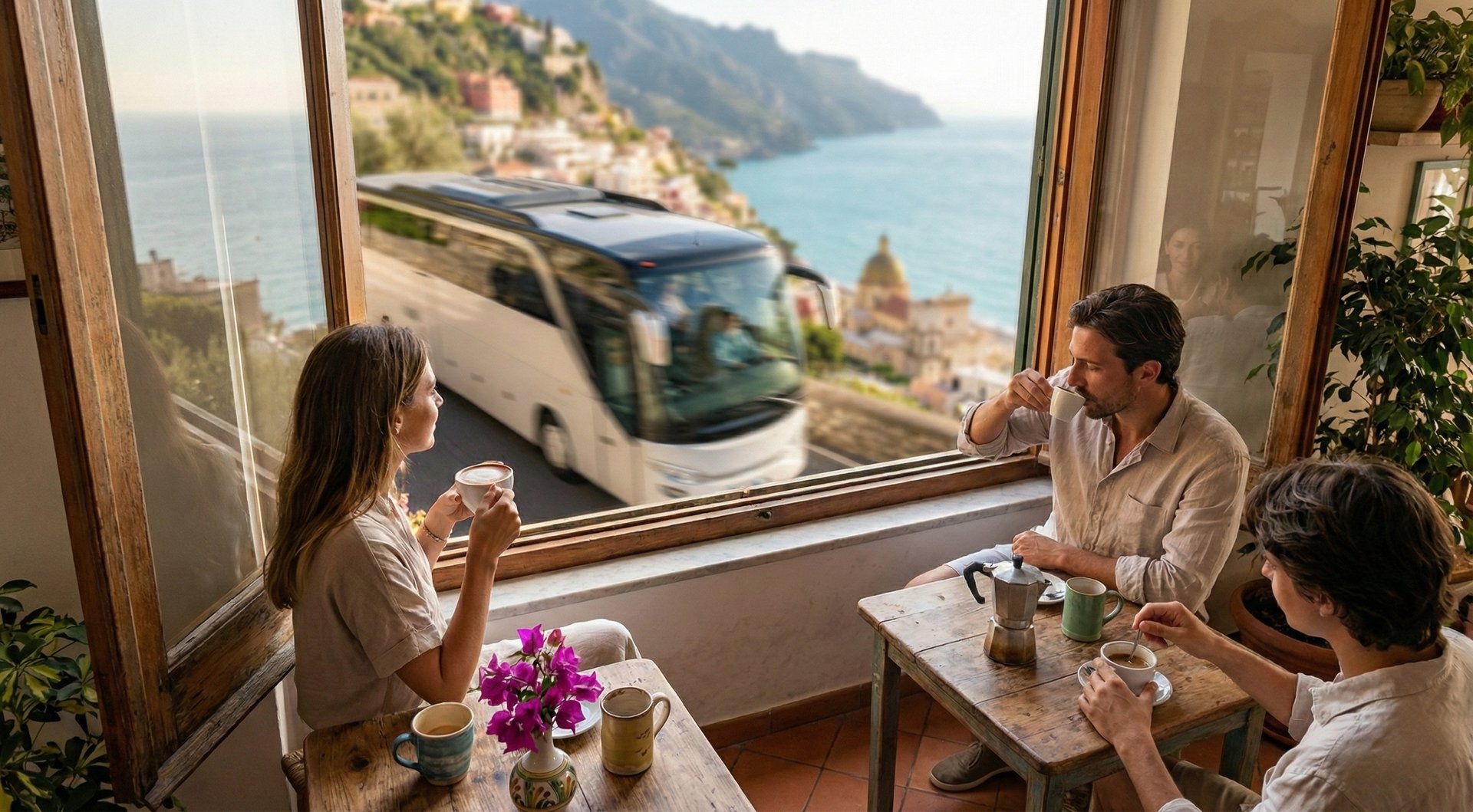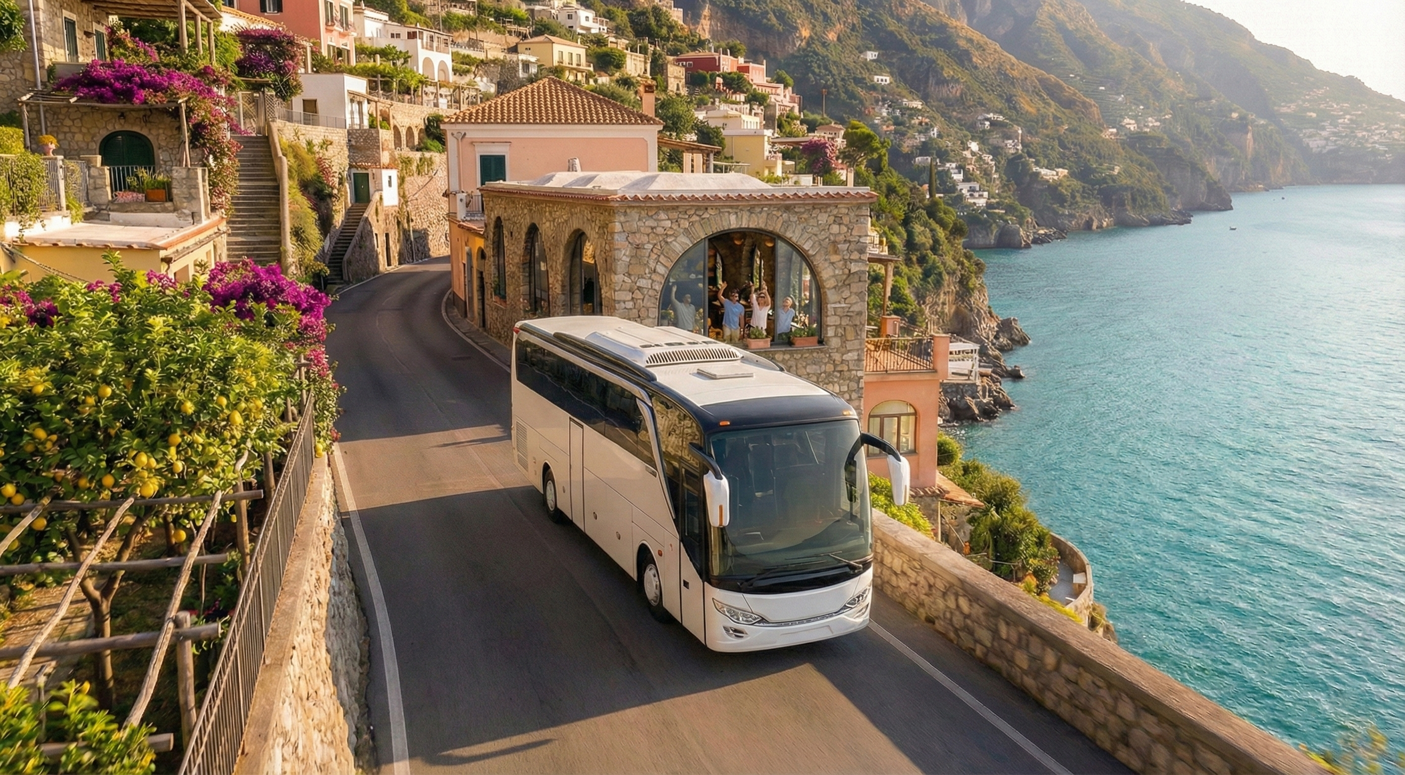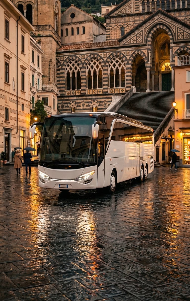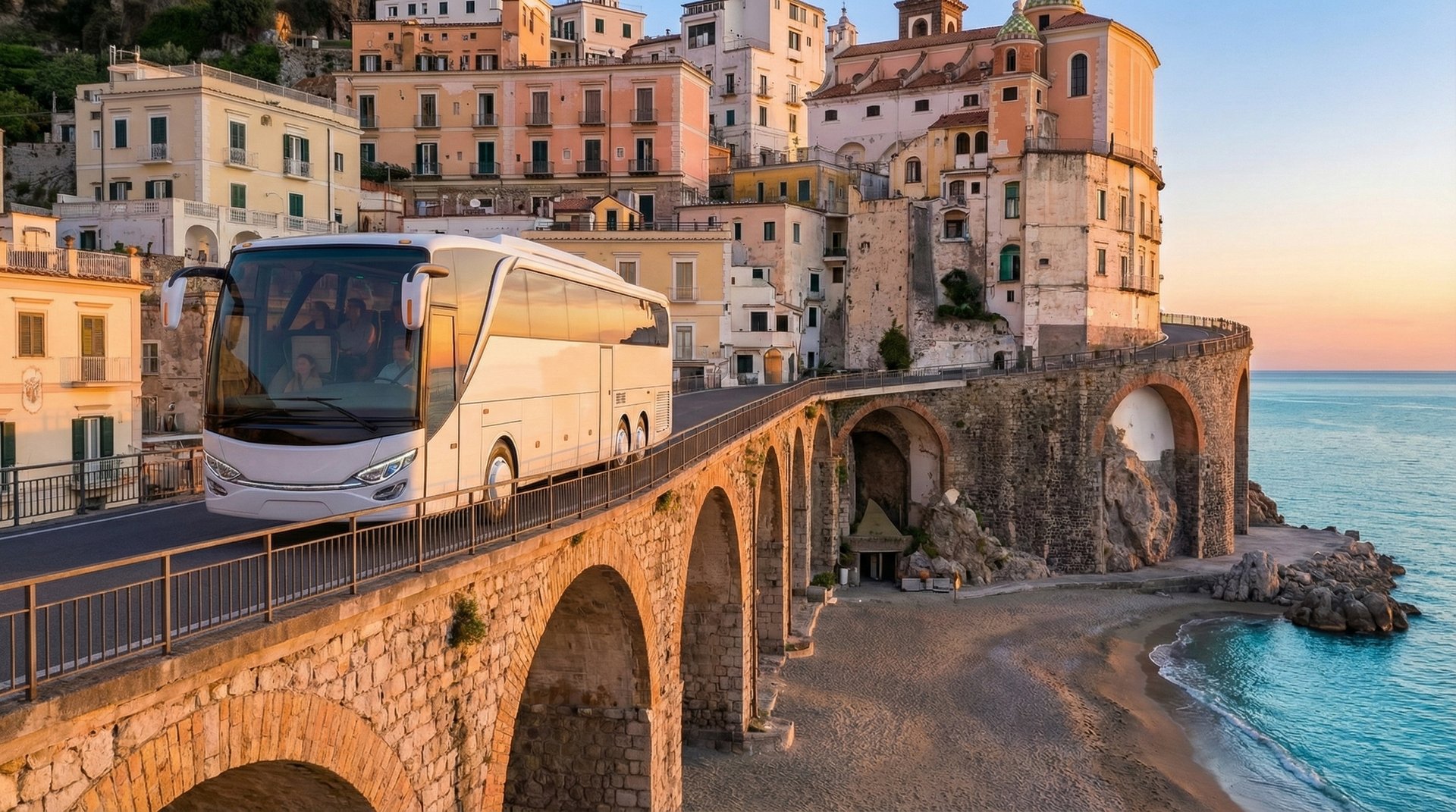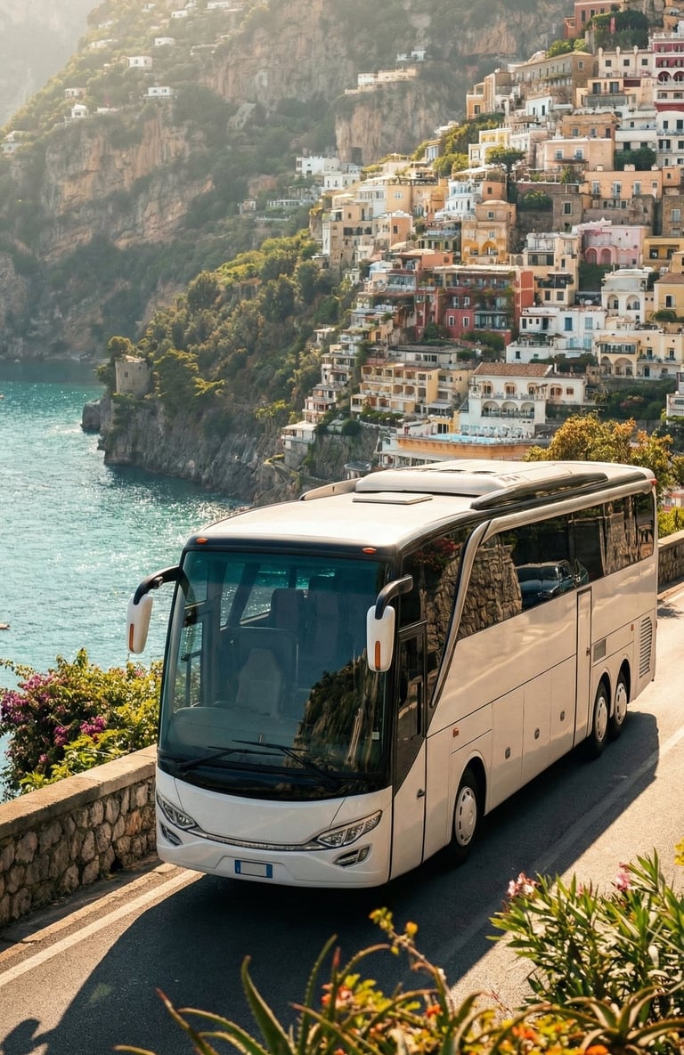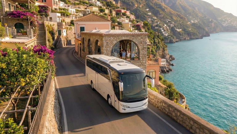 AI visualization: Jetbus 2 journeys along Italy’s Amalfi Coast—gliding through cliffside roads and seaside villages, framed by cinematic Mediterranean light, coastal architecture, and a timeless travel atmosphere.