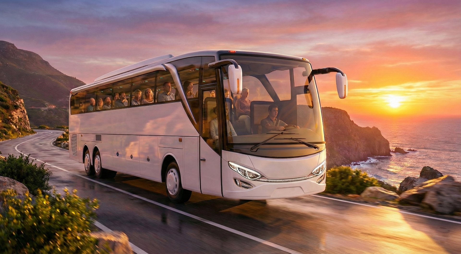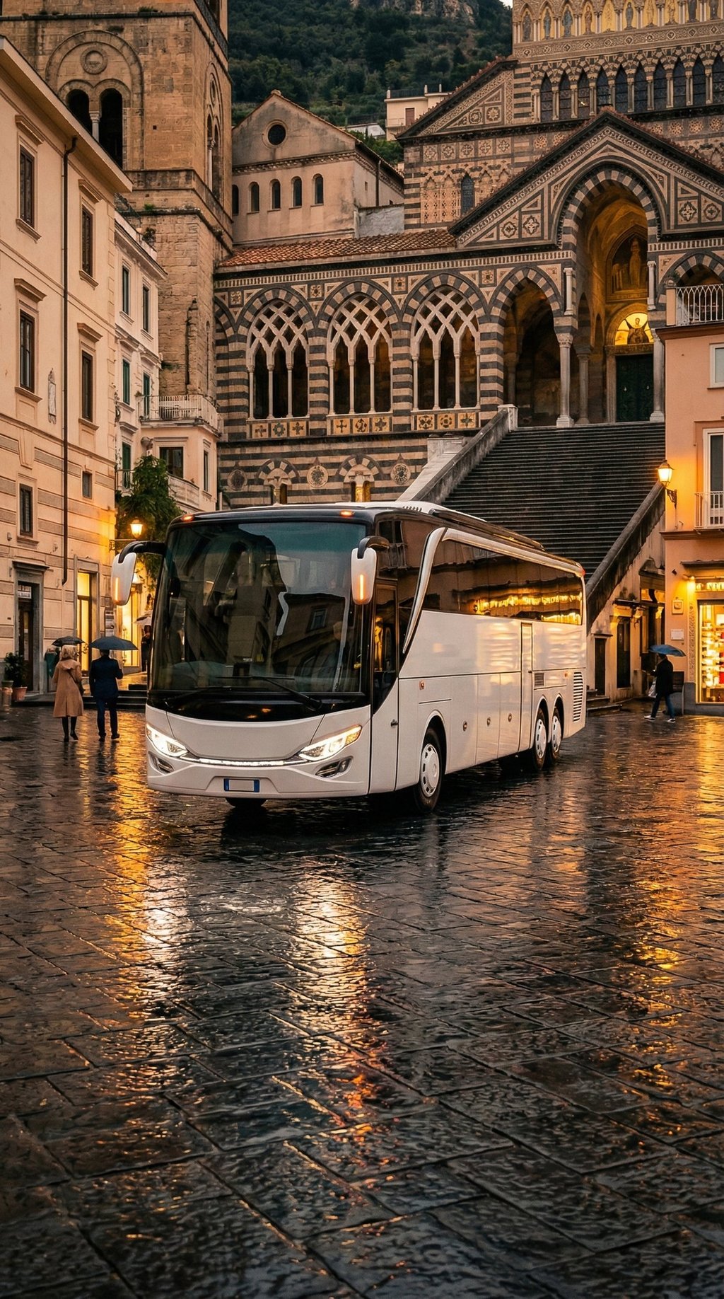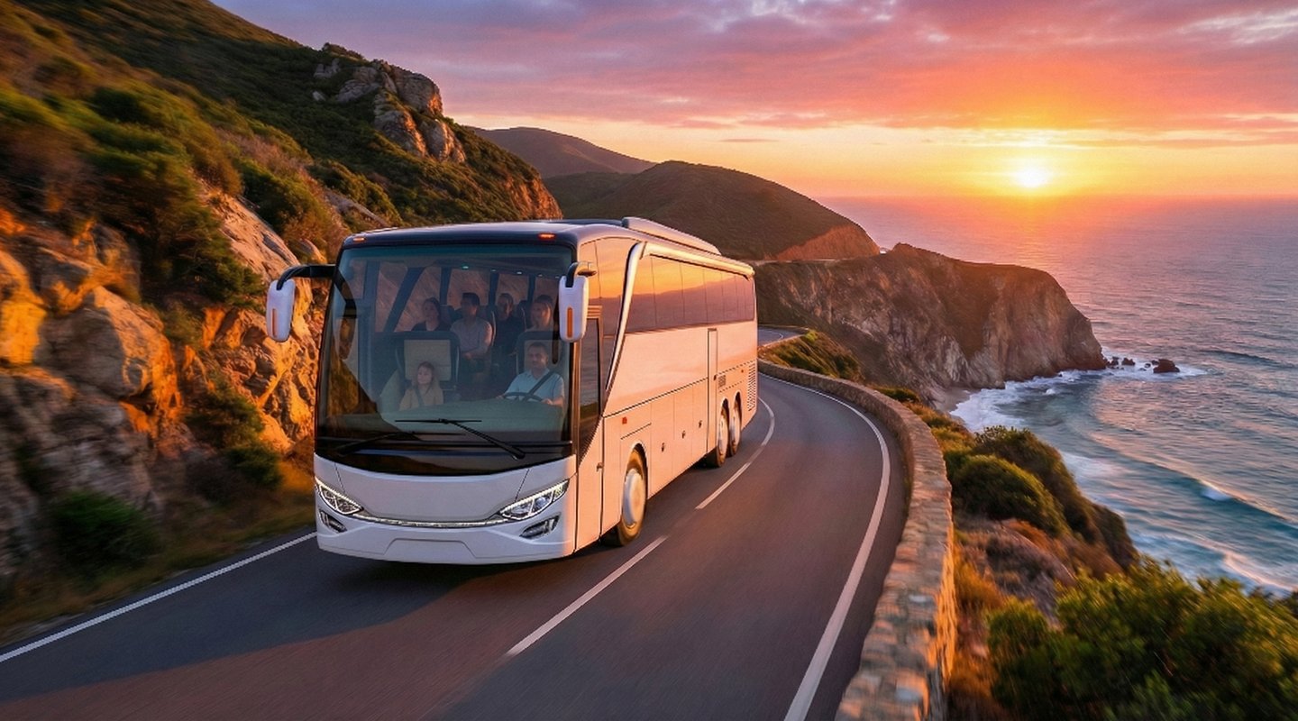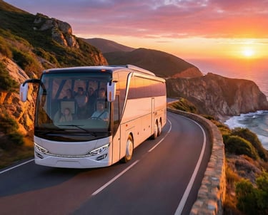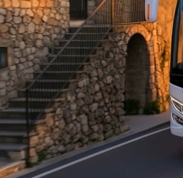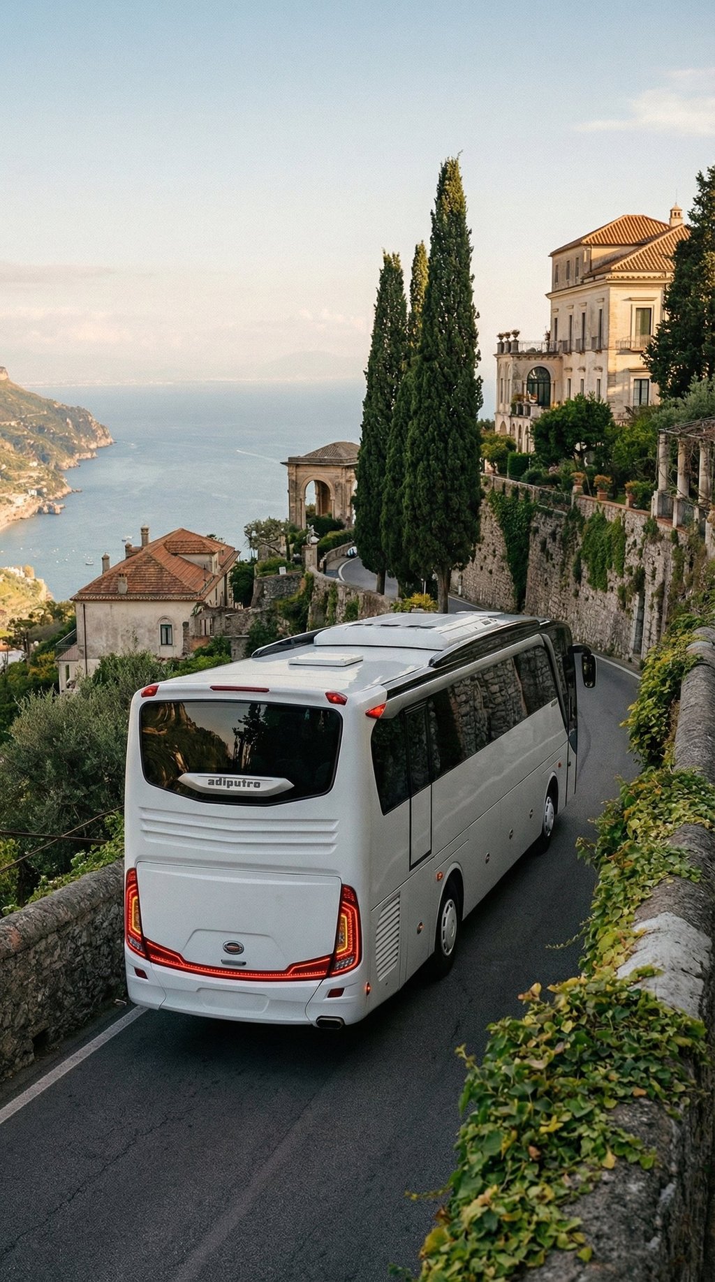 AI visualization: Jetbus 2 journeys along Italy’s Amalfi Coast—gliding through cliffside roads and seaside villages, framed by cinematic Mediterranean light, coastal architecture, and a timeless travel atmosphere.