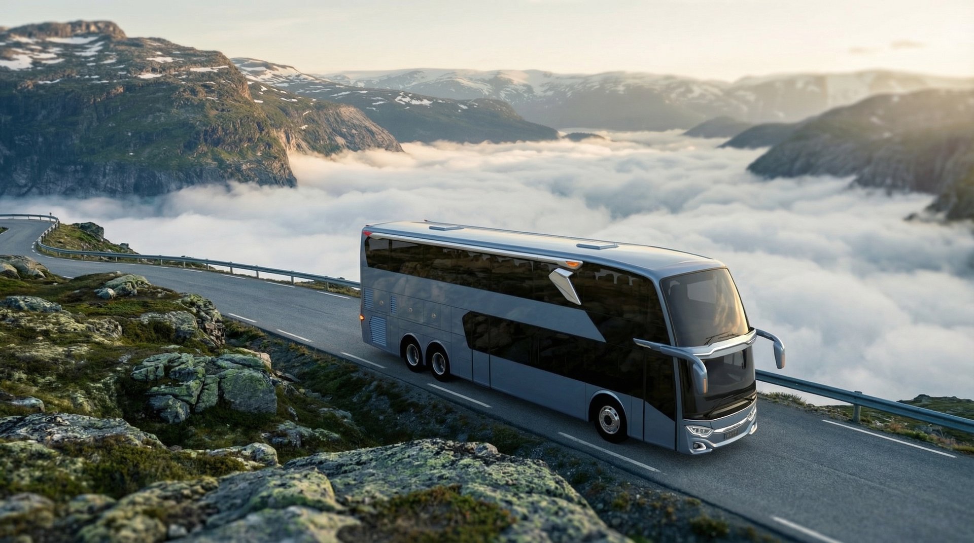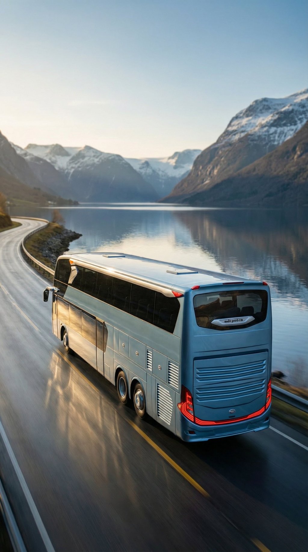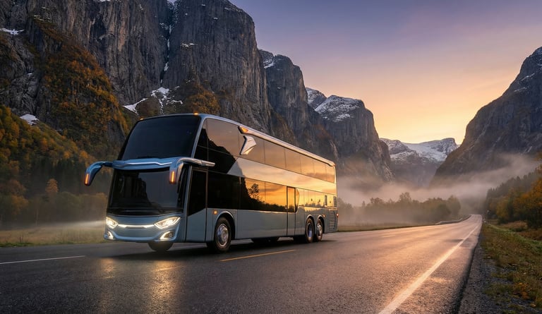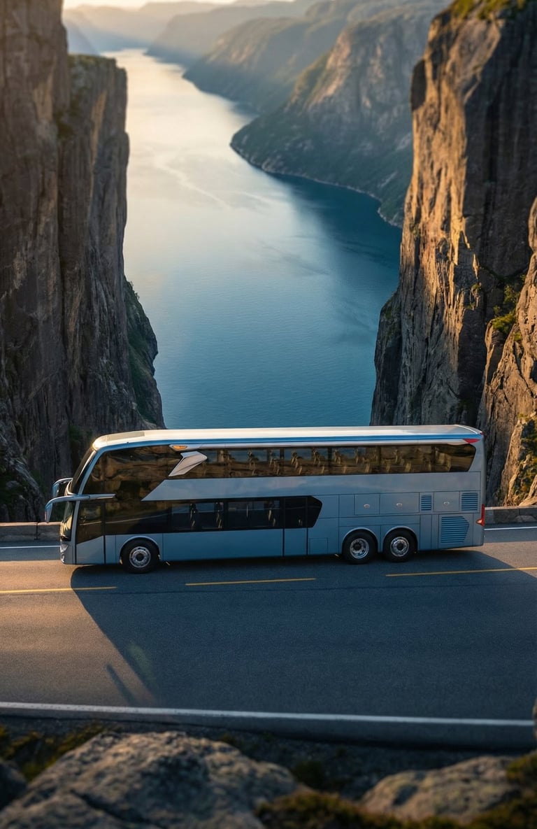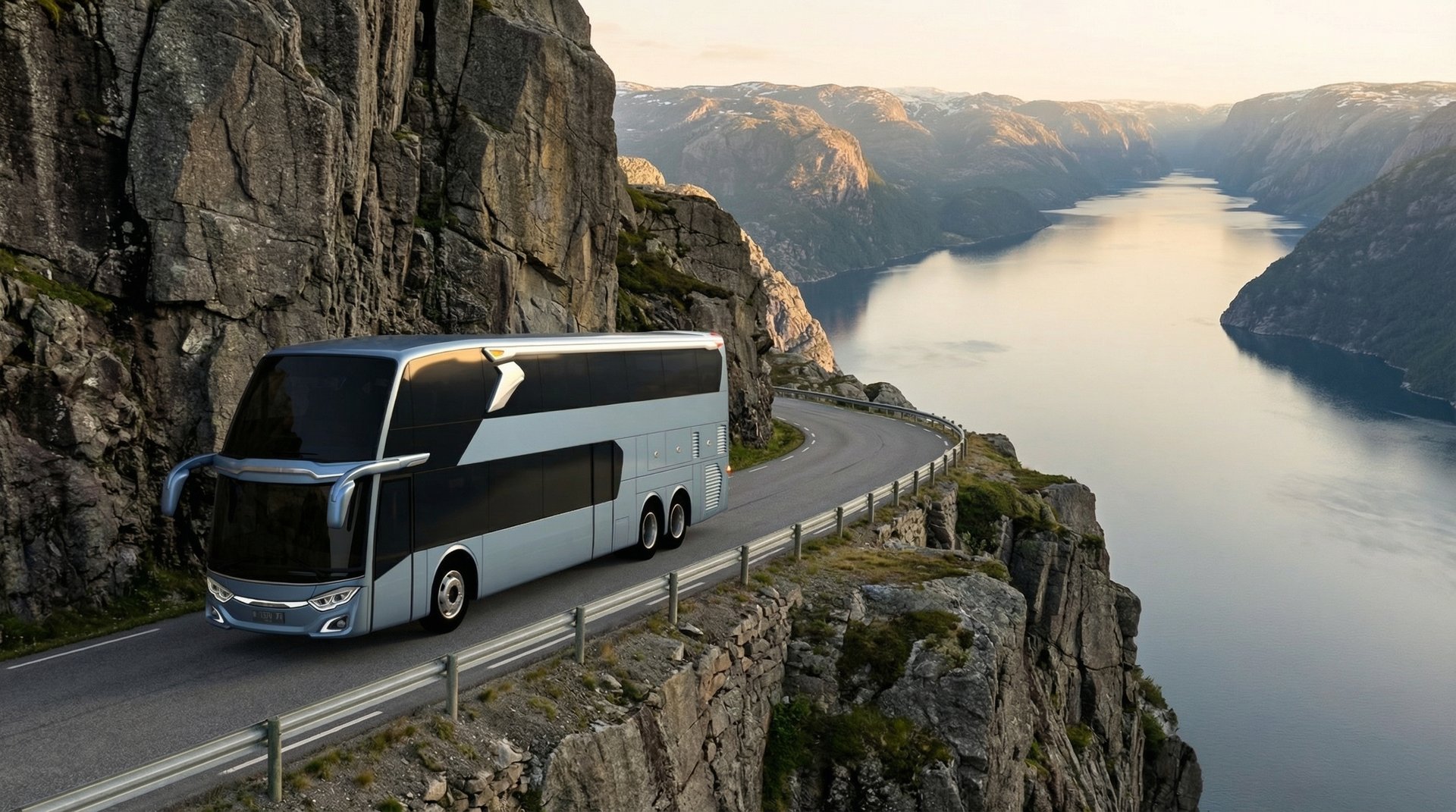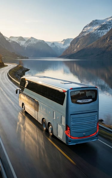 AI visualization: Jetbus 3 journeys through Norway’s dramatic landscapes—gliding along fjord-side roads and alpine passes, framed by crisp Nordic light, vast natural scenery, and a calm, contemporary travel atmosphere.