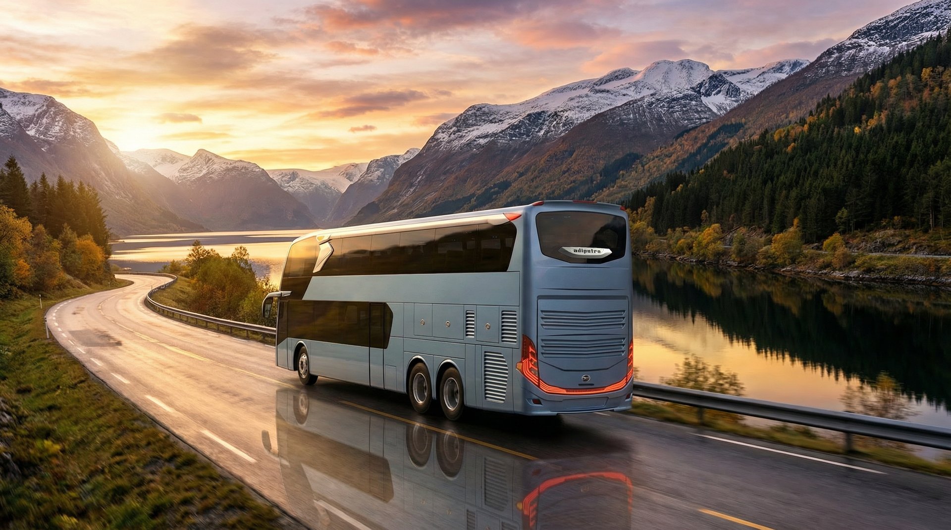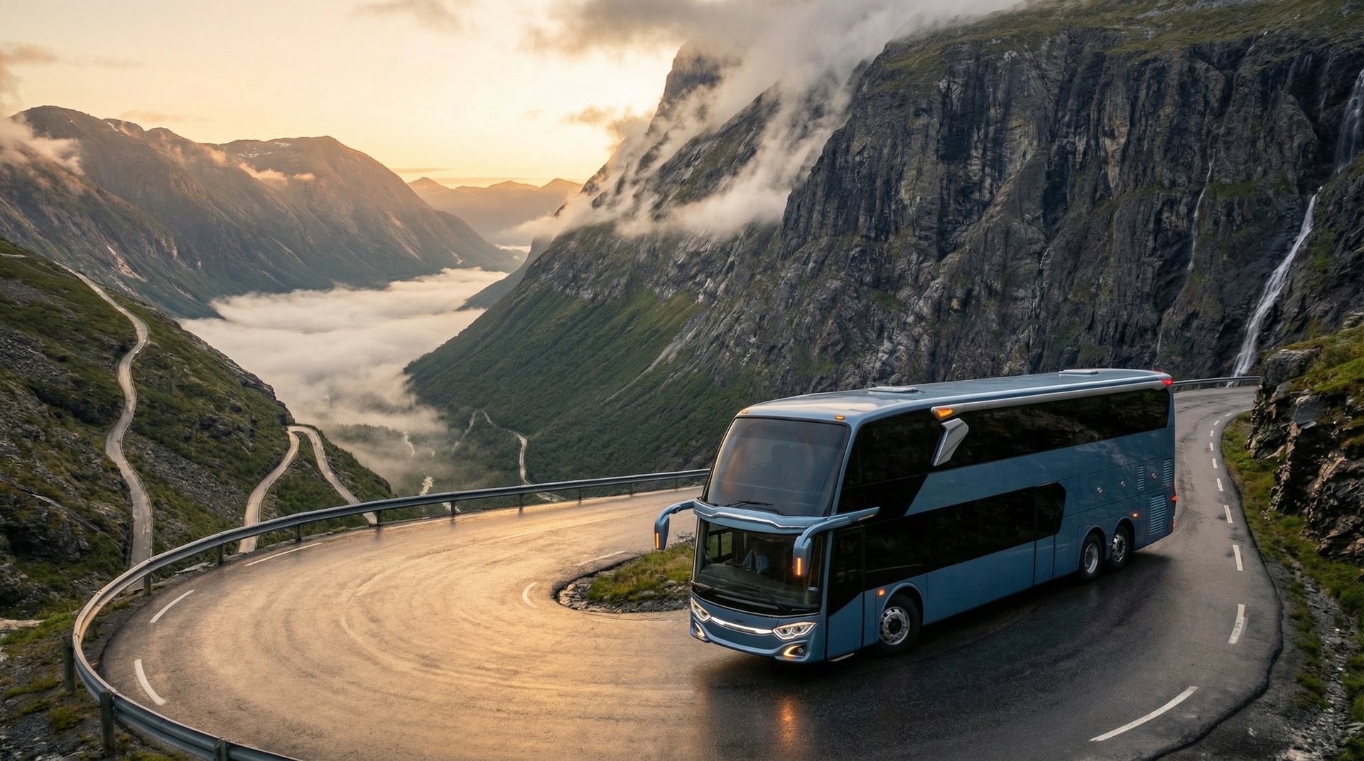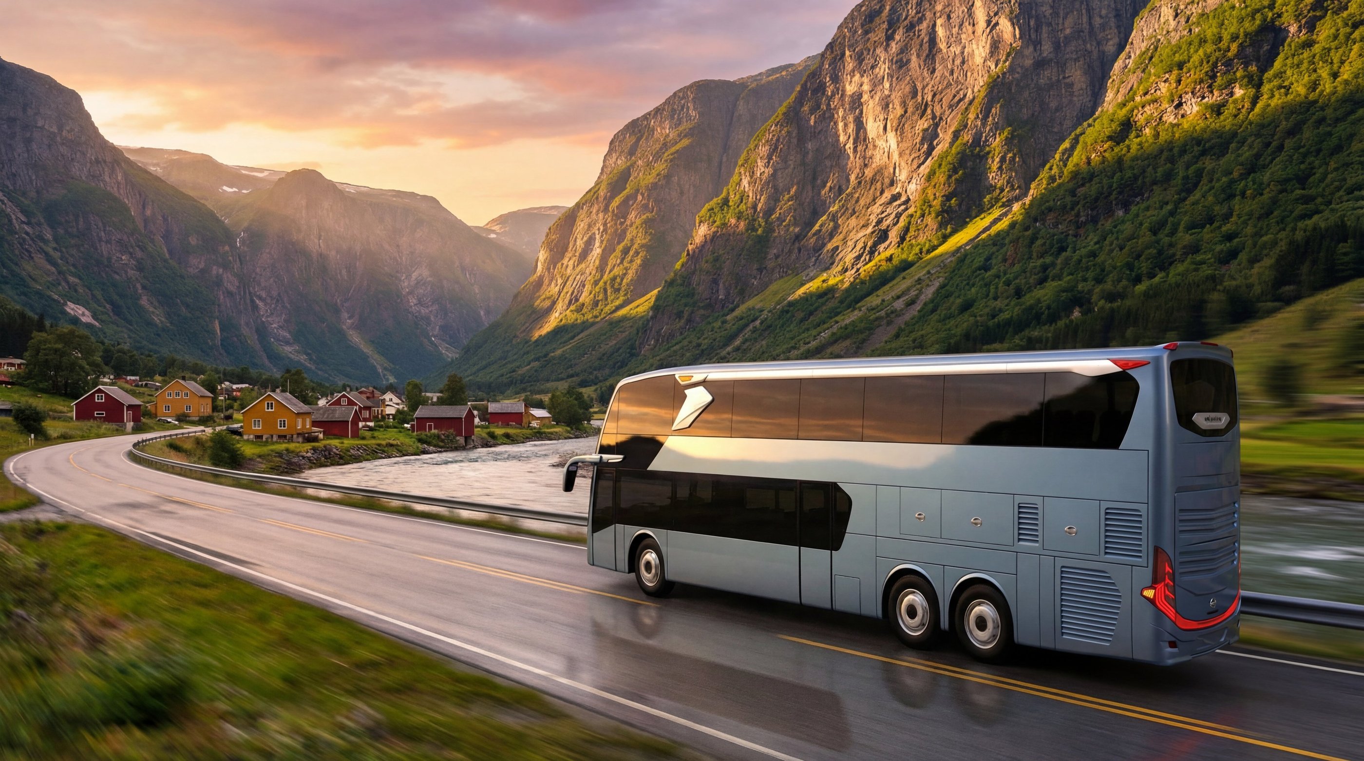 AI visualization: Jetbus 3 journeys through Norway’s dramatic landscapes—gliding along fjord-side roads and alpine passes, framed by crisp Nordic light, vast natural scenery, and a calm, contemporary travel atmosphere.