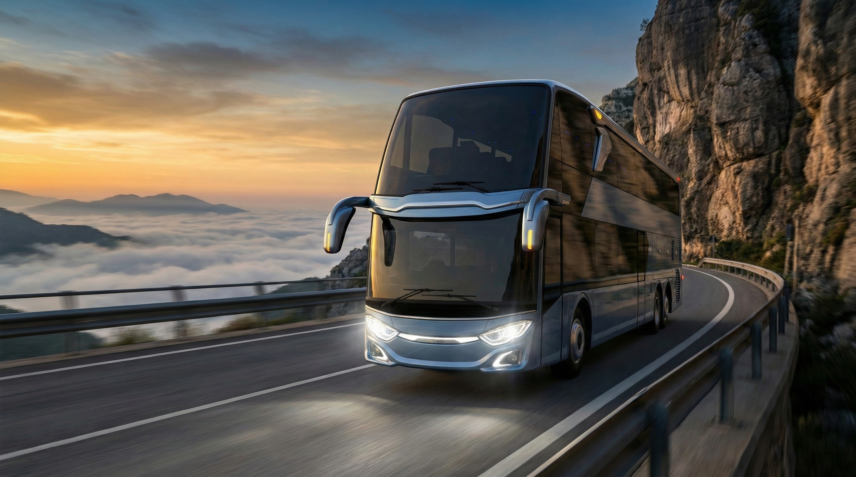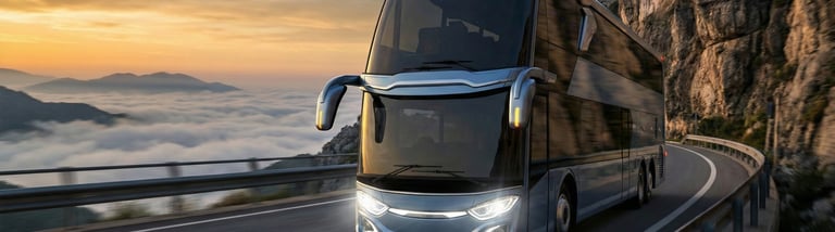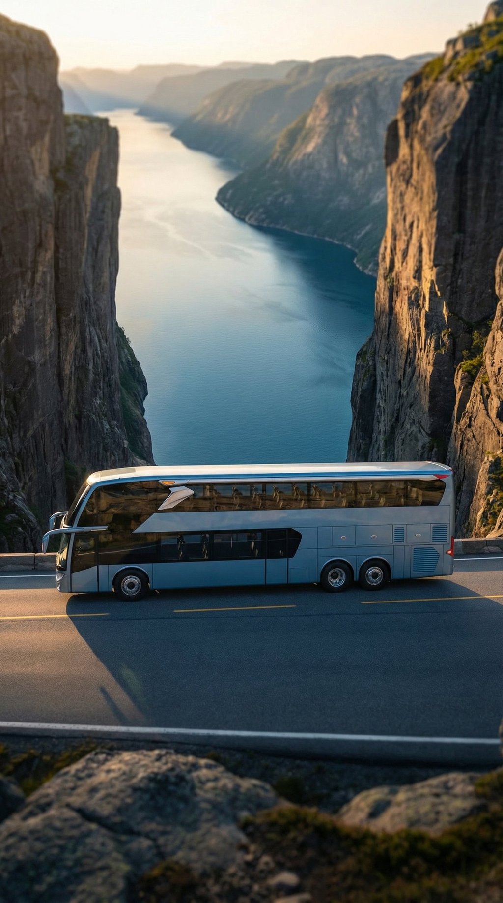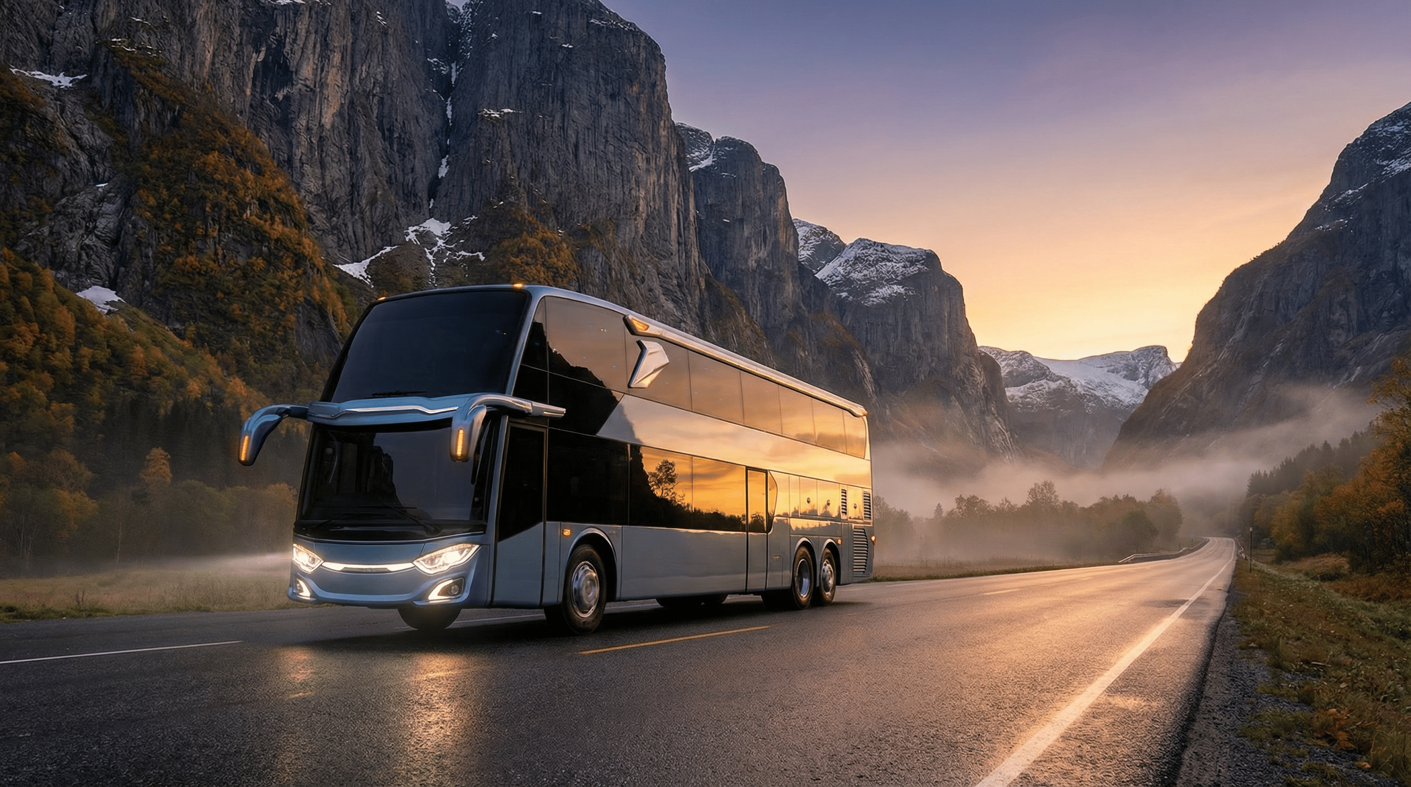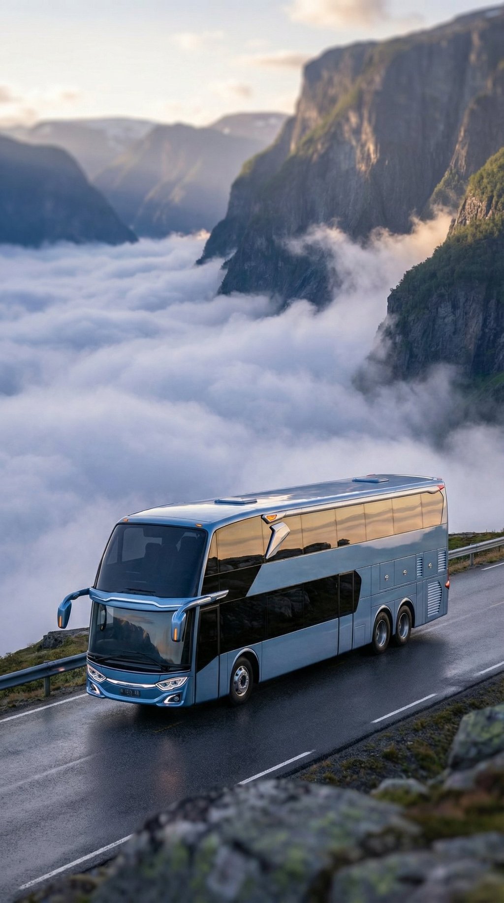 AI visualization: Jetbus 3 journeys through Norway’s dramatic landscapes—gliding along fjord-side roads and alpine passes, framed by crisp Nordic light, vast natural scenery, and a calm, contemporary travel atmosphere.