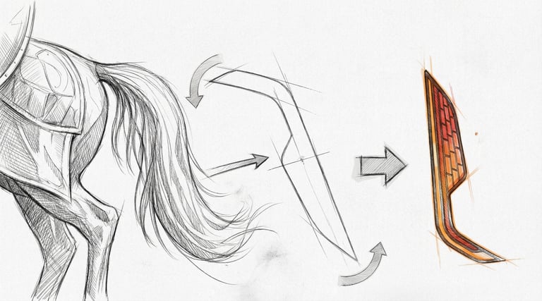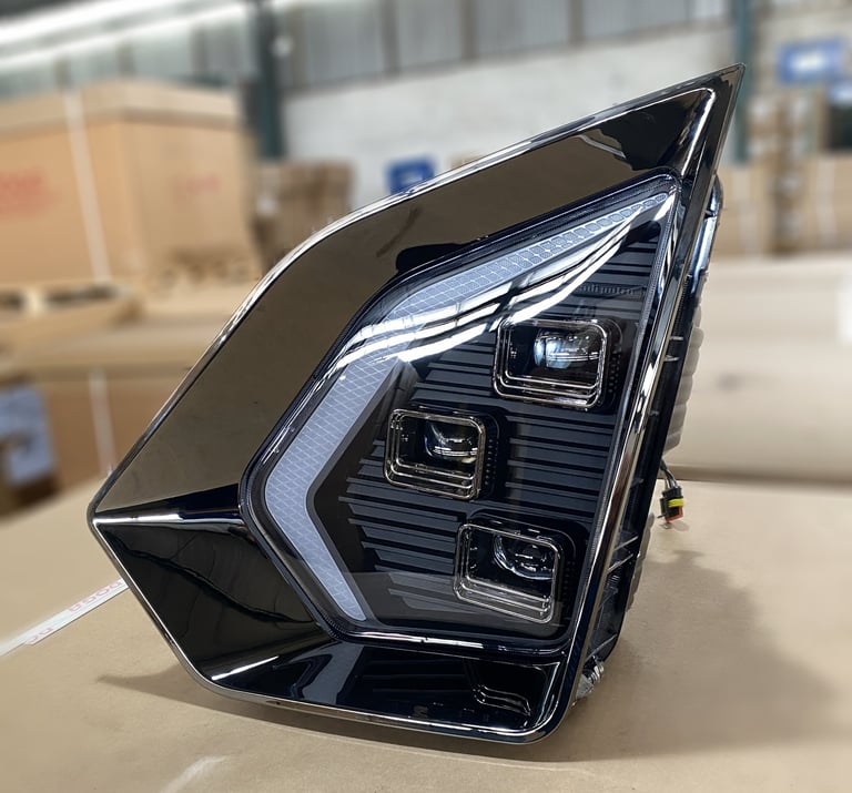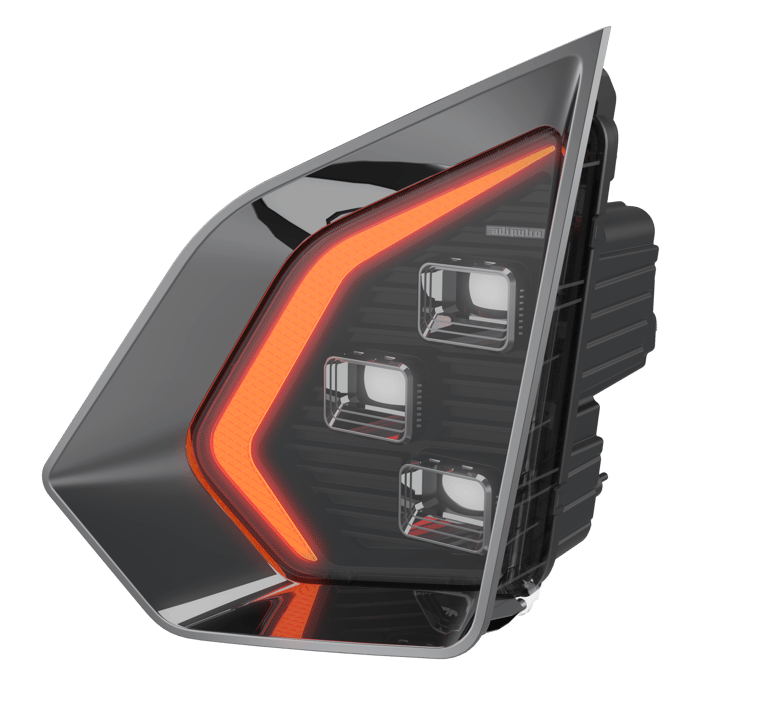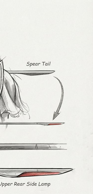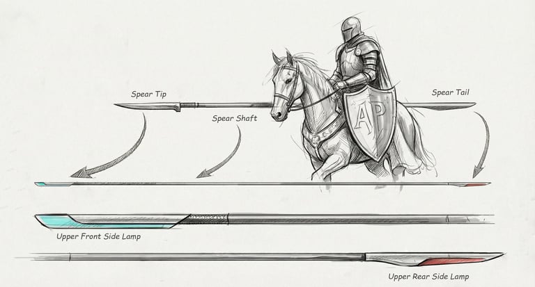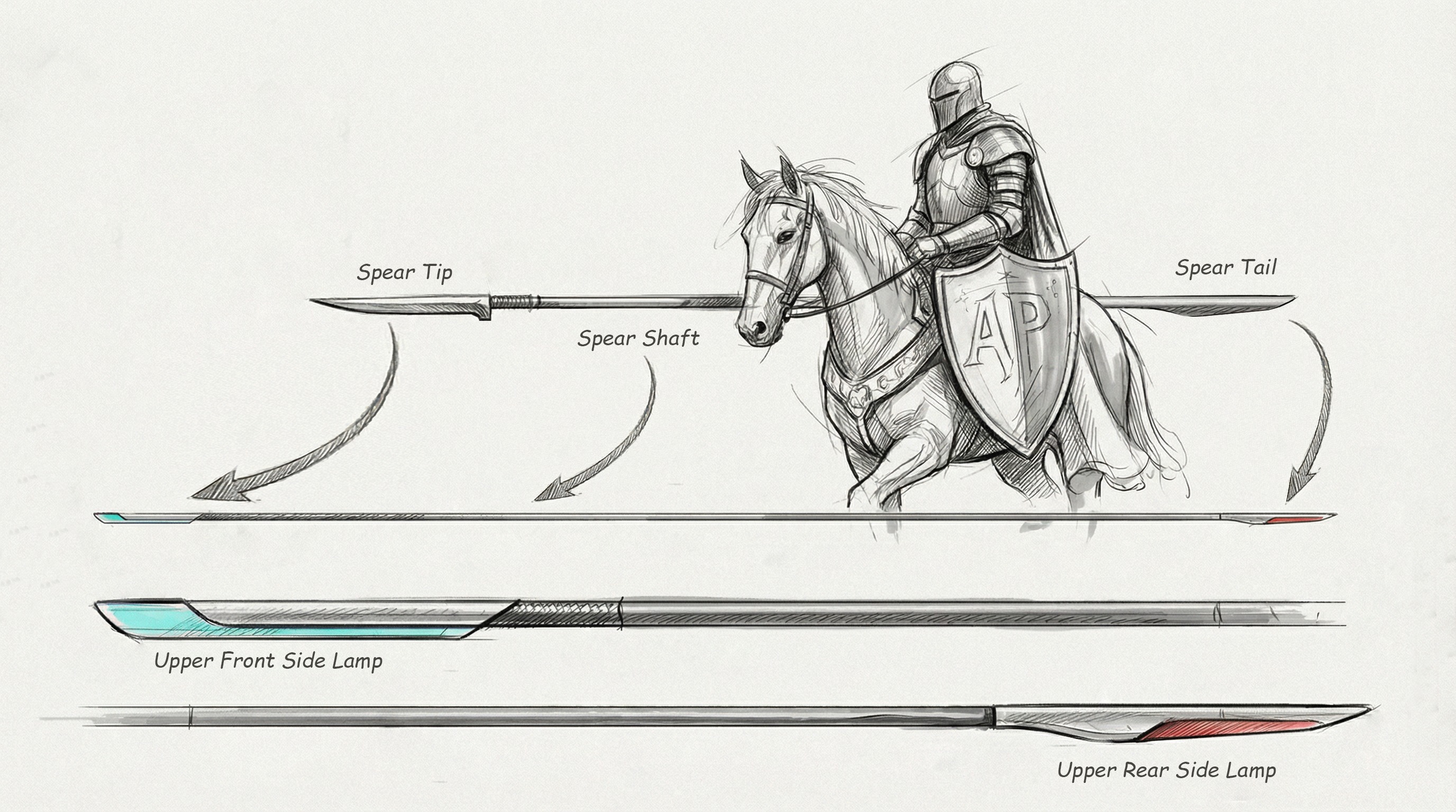 The upper front side lamp draws its form from the blade-like tip of the lance, expressing focus, sharp intent, and forward momentum.