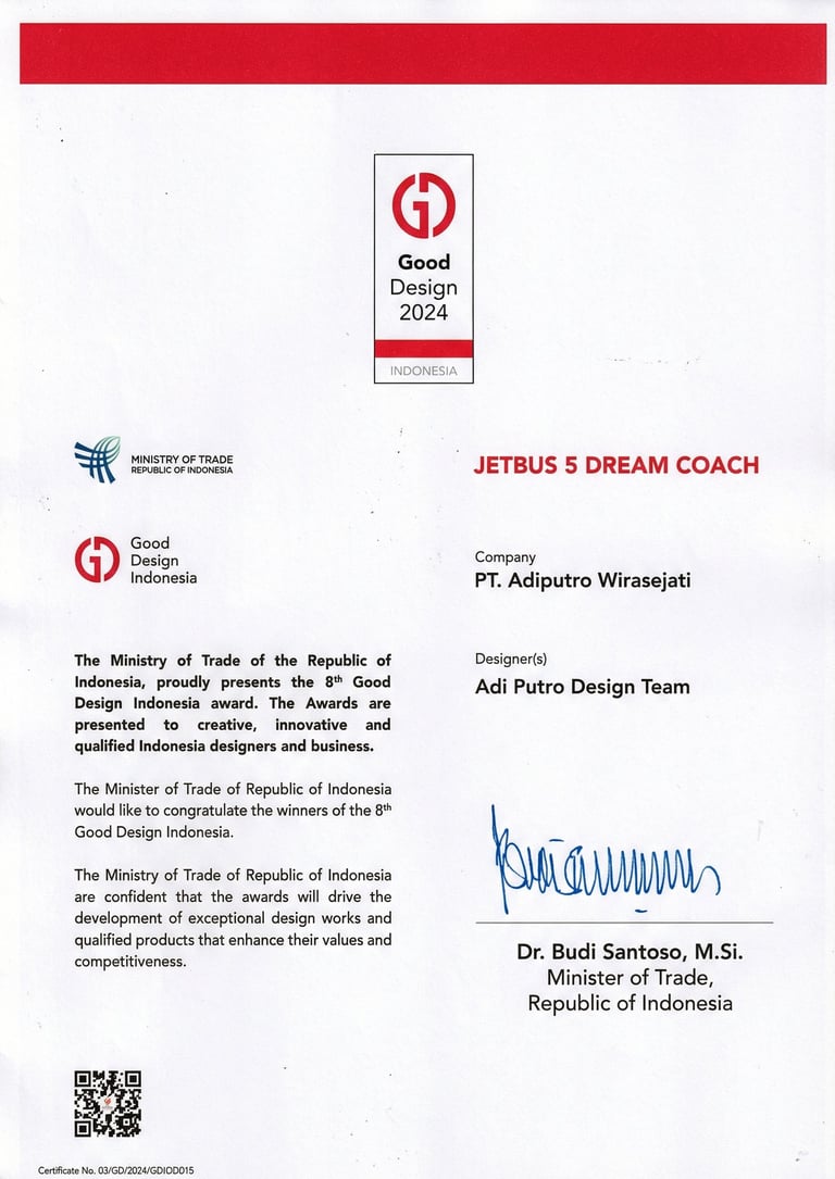 The Roman numeral V is then stylized and arranged into a circular pattern that radiates toward all cardinal directions—west, north, east, and south. This design philosophy represents a vision of hope that Jetbus 5 would be present, used, and embraced across every region of the nation.Today, that vision has become reality. Just one and a half years after its launch, in 2024, Jetbus 5 recorded sales of over 1,500 units within a single year. This achievement reflects the widespread distribution of Jetbus 5 throughout Indonesia, aligning perfectly with the four-cardinal-direction philosophy embedded in its design.