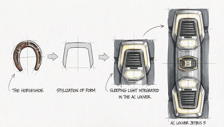 Inspired by the horseshoe, a timeless symbol of endurance and travel, the sleeping light is subtly stylized into the louver design. This gentle illumination reflects the Jetbus 5 philosophy, where exterior character and interior comfort are seamlessly connected.