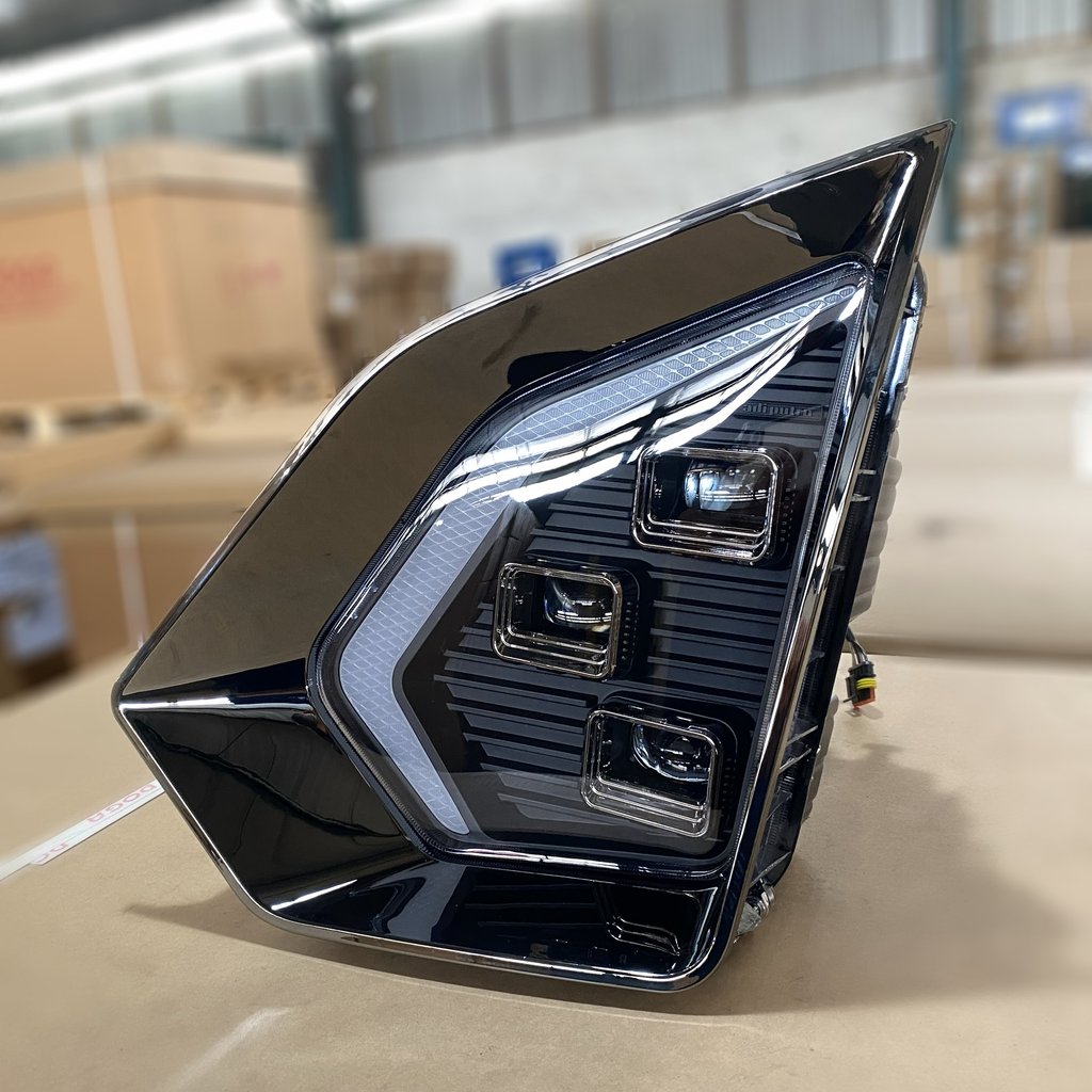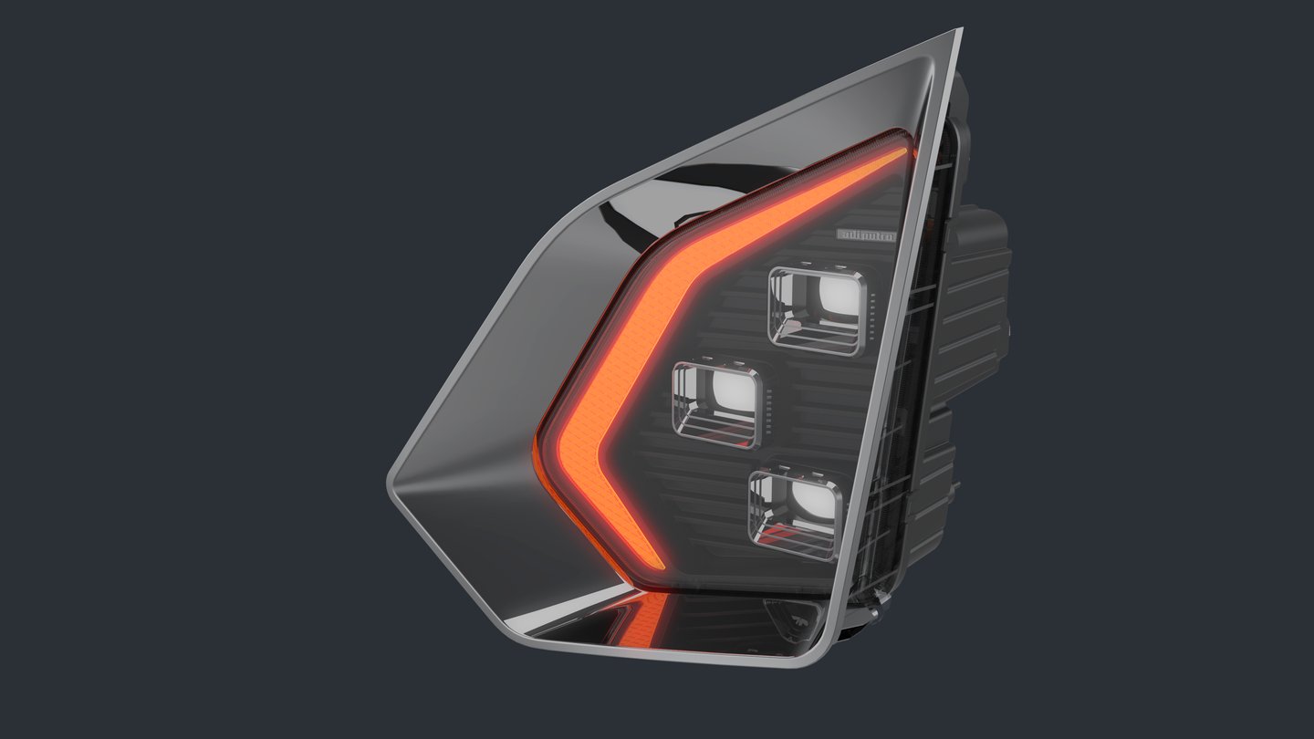 The upper front side lamp draws its form from the blade-like tip of the lance, expressing focus, sharp intent, and forward momentum.