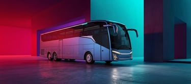 Futuristic coach with clean surfaces and assertive stance; exploration of long-body flow and light graphics.